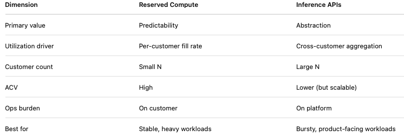 Reserved compute platforms and inference APIs are both attractive, but for opposite reasons: one monetizes predictability with fewer, larger customers; the other monetizes utilization through aggregation across many smaller customers.