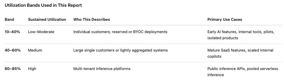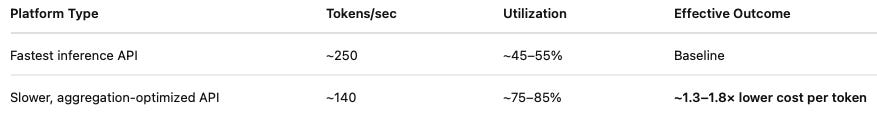 Exceptional breakdown of the utilzation economics. The part about statistical multiplexing really nails why platform-level aggregation works even with bursty startup workloads. I've noticed similar patterns when sizing inference infra where even a 2x speedup in tokens/sec barely moves the needle if you're sitting at 35% util.
