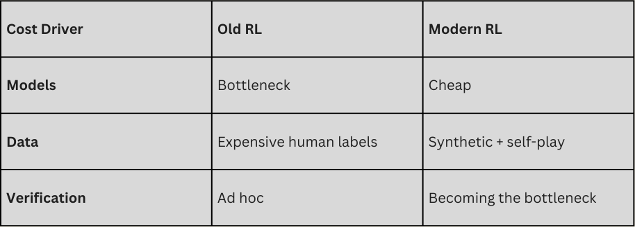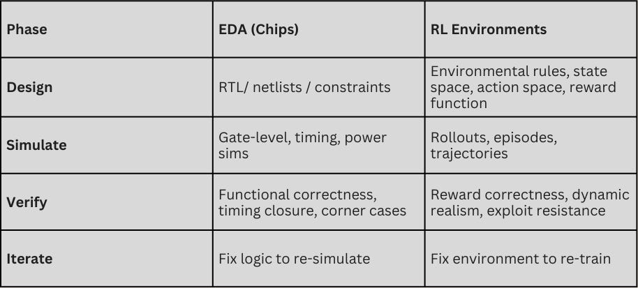 Enter reinforcement learning. Today, RL environments are playing the same role for AI agents that EDA played for silicon.They translate human intent into executable behavior by making success measurable at scale. But unlike EDA, they must also address how the “spec” for human labor is not deterministic. “Correct” is a moving target with many dimensions, and as agents improve, it becomes harder to measure success with a clean, dependable signal. As a result, RL environments must be living systems that evolve to resist reward hacking and encode judgment. This makes verification—not models—the true bottleneck to automation.