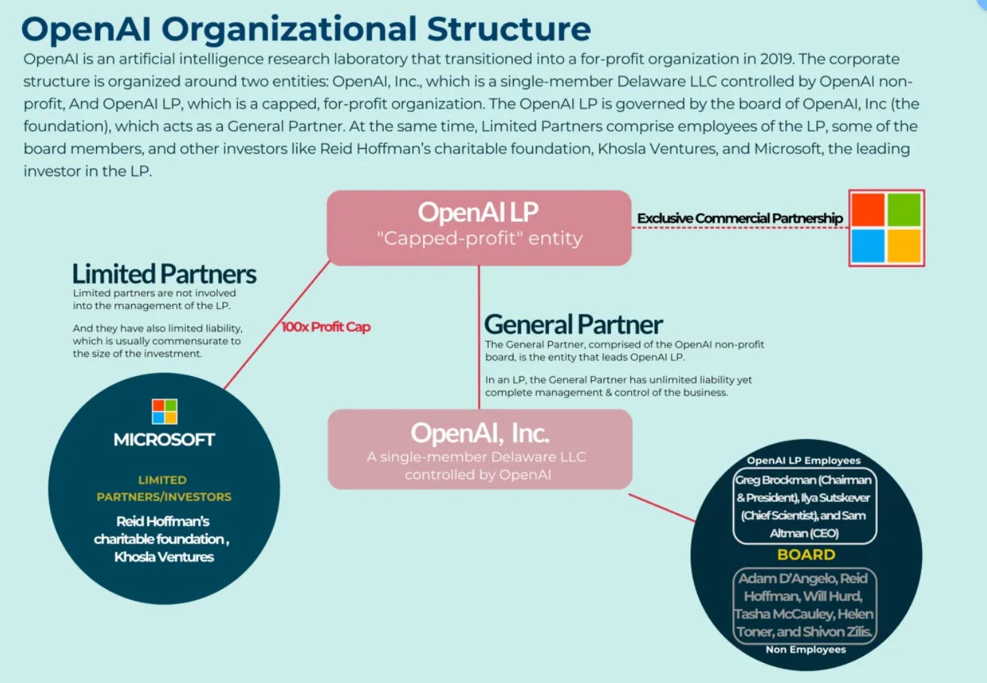 OpenAI’s board has experienced significant changes this year, with Sam’s departure marking the 4th board member to leave just this year: Reid Hoffman left due to investment conflicts, Elon Musk associate and Neuralink exec Shivon Zillis left in March, while Will Hurd left in July per Bloomberg. The majority of the board is independent, and the independent directors do not hold equity in OpenAI. OpenAI’s board of directors consists of OpenAI chief scientist Ilya Sutskever, independent directors Quora CEO Adam D’Angelo, technology entrepreneur Tasha McCauley, and Georgetown Center for Security and Emerging Technology’s Helen Toner. As a part of this transition, Greg Brockman will be stepping down as chairman of the board and will remain in his role at the company, reporting to the CEO. Below details the organizational structure of OpenAI: