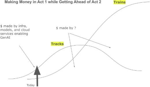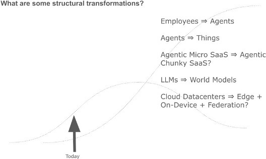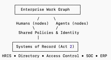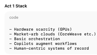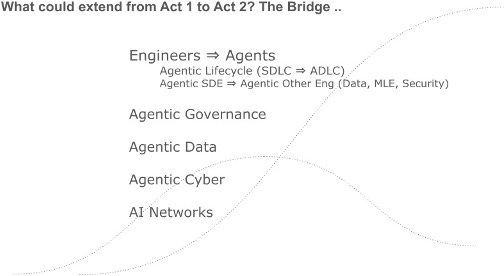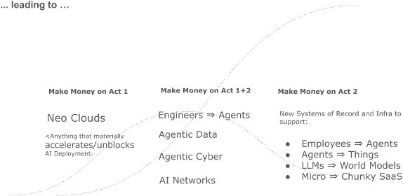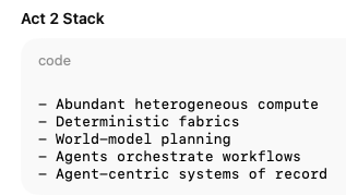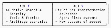 Act 2 represents the structural transformation phase: where firms that dominate Act 2 will emerge not from “micro” rewrites using AI, or tooling where the foundational layers can eat into over time, but from foundational redefinitions of “how work happens” AND “lessons learned” from Act 1 that help create more enduring systems — imagine an enterprise org hierarchy not just being defined by employees but also agents as first class organizational elements - entire systems of record such as HR and core infrastructure services such as Active Directory will need to be reimagined.