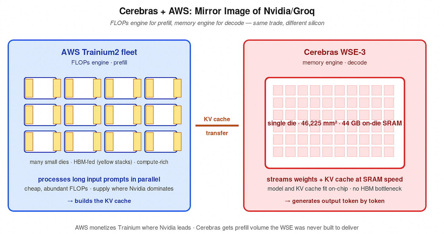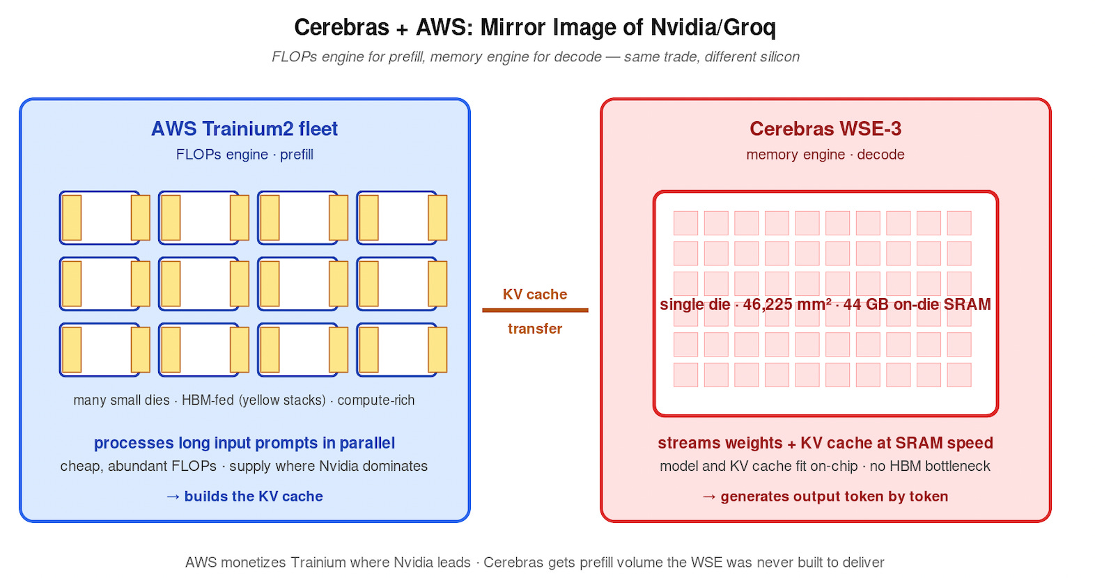 AWS Trainium fills the gap. Trainium2 is a high-FLOPs, HBM-equipped accelerator built for compute-bound work. The integrated Cerebras–AWS stack runs prefill on Trainium fleets, hands KV state to Cerebras CS-3 systems, and serves decode at wafer-scale bandwidth. AWS monetizes Trainium silicon on a workload where Nvidia GPUs already dominate. Cerebras gets the prefill volume the WSE was never designed to deliver.