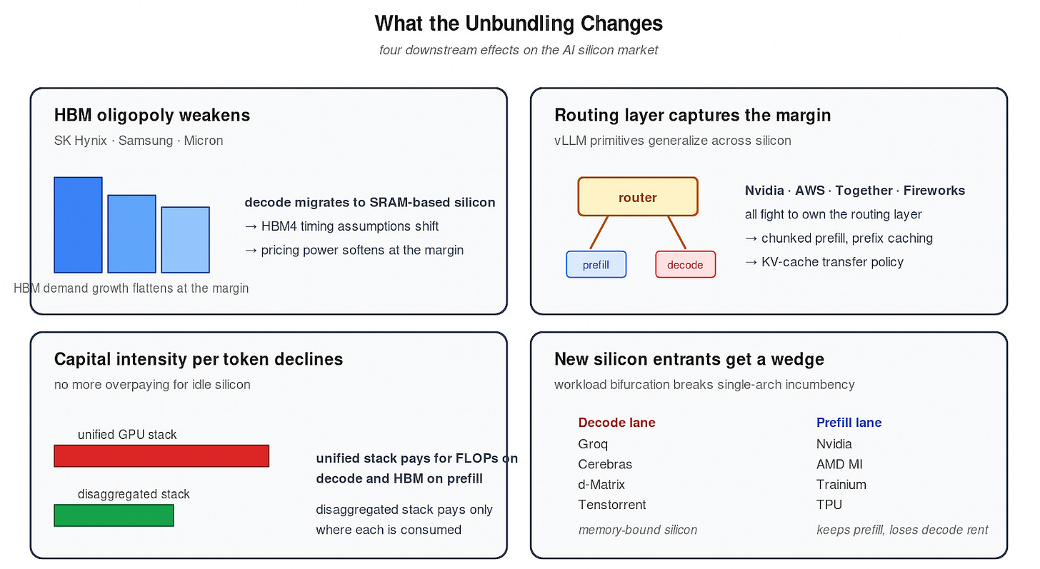 New silicon entrants get a clearer wedge. The single-architecture incumbency advantage erodes when the workload itself is two distinct workloads. Memory-bound silicon (Groq, Cerebras, d-Matrix, Tenstorrent) gets a defensible decode lane. Compute-bound silicon keeps prefill but loses its decode rent.