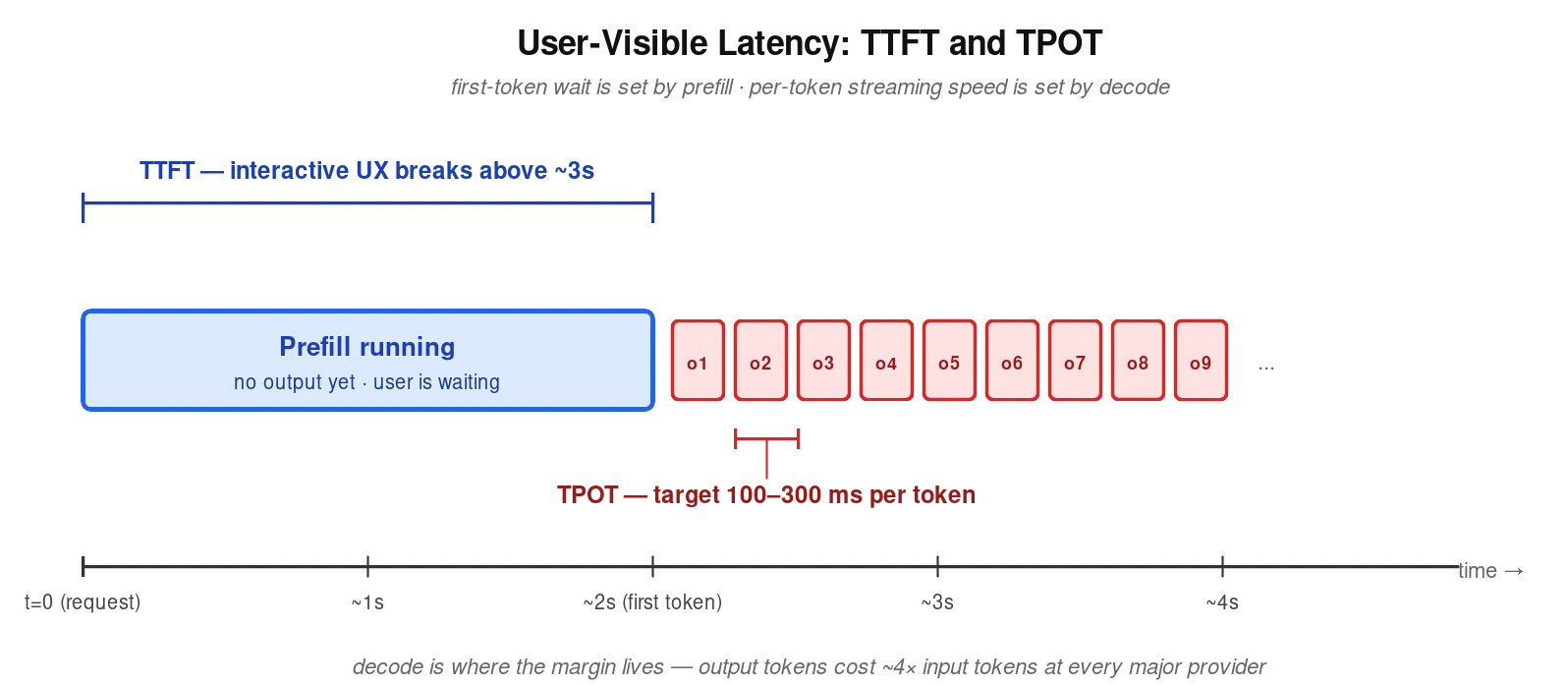 Time to first token (TTFT) is set by prefill. Interactive UX breaks above roughly 3 seconds.