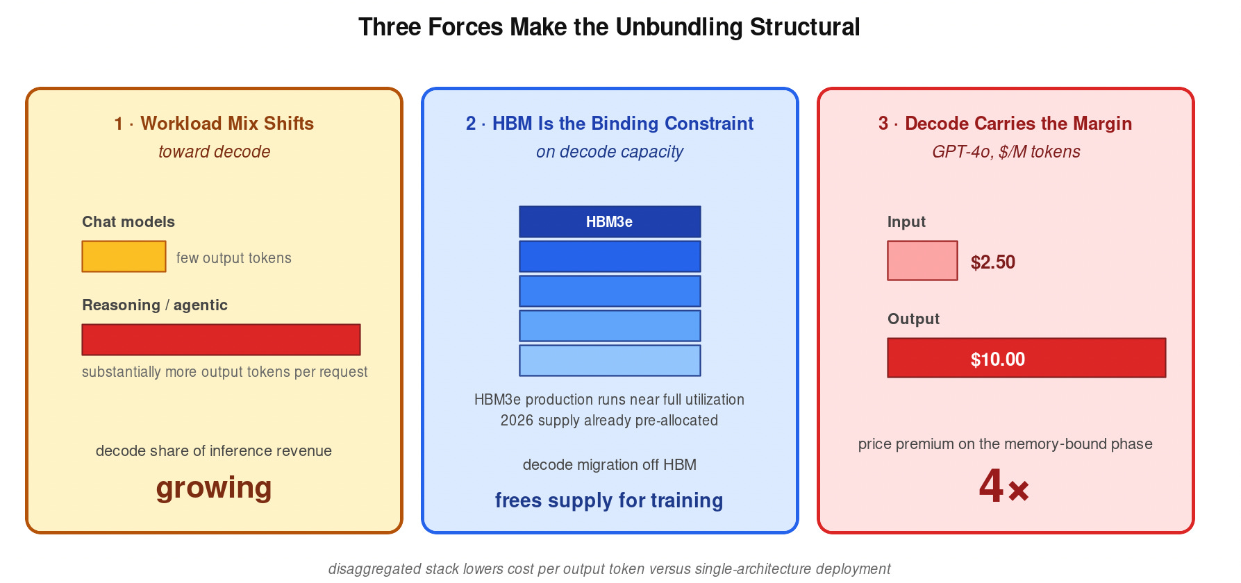 Capital intensity per token declines. A unified GPU stack overpays for FLOPs on decode and overpays for HBM on prefill. The disaggregated stack pays for each only where it is consumed.