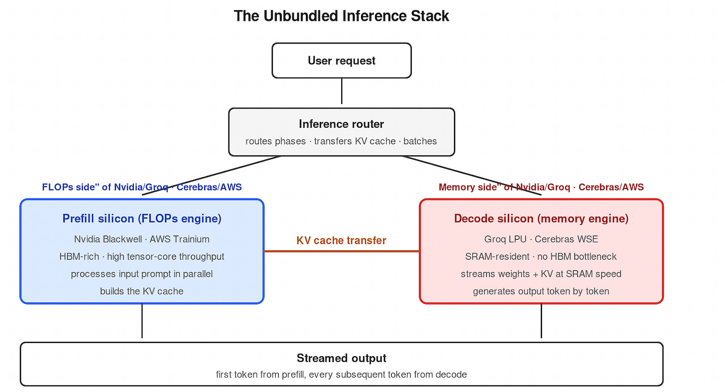 Prefill and decode are different physics. Different roofline regimes. Different cost structures. Different margin profiles. Inside a single GPU, scheduler-level disaggregation already pays. Across silicon, Nvidia/Groq and Cerebras/AWS are the same trade — pair a compute engine with a memory engine, route the workload, capture the spread.