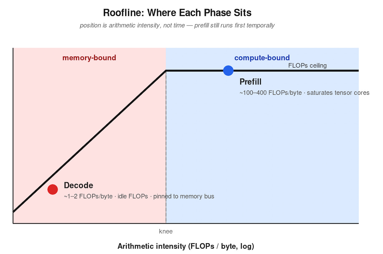 Modern GPUs are designed around HBM-fed tensor cores. Prefill uses both. Decode uses neither well — the tensor cores idle while HBM saturates streaming weights for a single output token at a time. Plot it on a roofline and the two phases sit on opposite sides of the knee.