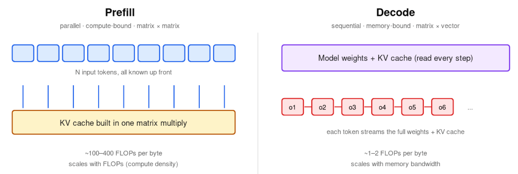 Prefill processes the input prompt. Every prompt token is known up front, so the model computes their key/value vectors in parallel — one large matrix multiply that builds the KV cache. Compute-heavy. FLOPs-bound. High arithmetic intensity, on the order of 100–400 FLOPs per byte read.